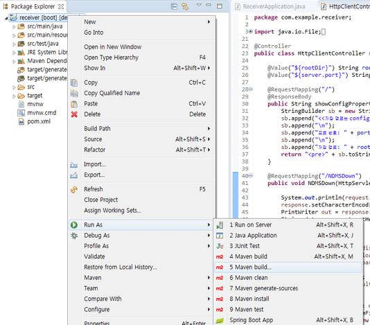 2. 프로젝트 마우스 오른쪽 클릭 > Run As > Maven Build... 를 선택합니다.