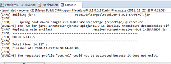 4. 결과가 아래처럼 나왔다면 성공입니다. 메시지 중 [WARNING]은 정상 실행 여부와는 무관하므로 일단 무시해도 좋습니다.