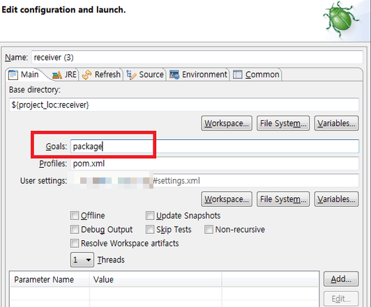 3. Goals 란에 package라고 입력하고, 나머지는 변경하지 않습니다.