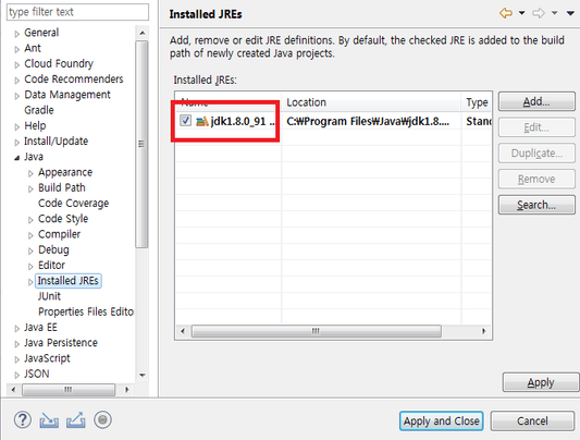 1. Window > Preference 에서 Installed JREs의 경로에서 JRE를 JDK로 변경합니다.