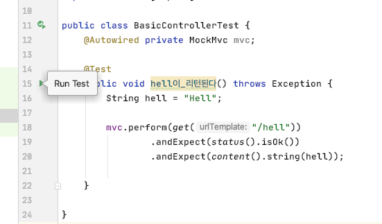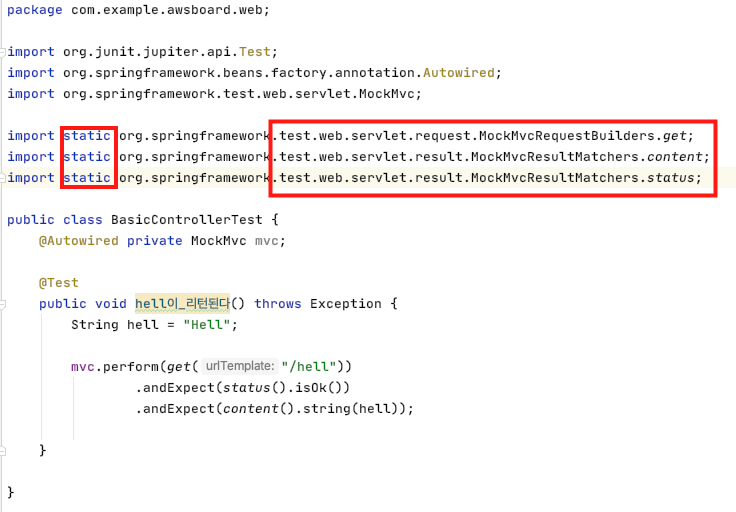@Autowired private MockMvc mvc;- HTTP GET, POST 등에 대한 API 테스트 시작mvc.perform(get("/hell"))-MockMvc를 통해 HTTP GET 요청.andExpect(status().isOk())- HTTP Status가200(OK)인지 검증.andExpect(content().string(hell))- 응답 본문의 내용이hell과 일치하는지 검증