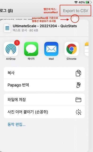 10-13 라인은 아이패드에서 충돌이 발생하는 것을 방지하기 위한 것입니다. 만약 아이폰에서만 동작하는 앱인 경우, 이 부분과 함수의sourceRect파라미터는 제외해도 됩니다.- 아이패드(iPadOS)는 공유 메뉴를 아래 그림과 같이 popover presentation 방식으로 출력합니다.