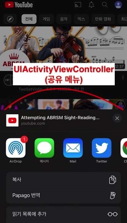 이러한 공유 메뉴를 _Acitivity View_라고 합니다. Swift에서는 UIActivityViewController로 공유 메뉴를 띄울 수 있습니다.
