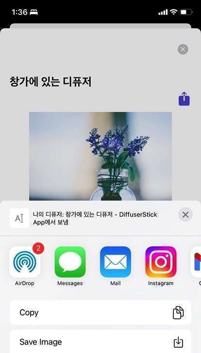 공유 메뉴는 아래와 같은 형태로 수많은 앱에서 [공유], [공유하기] 등의 이름으로 존재하는 기능입니다. 특정 메시지나 URL, 이미지, 파일 등을 에어드롭(AirDrop)이나 메시지, 메일, 다른 앱으로 보낼 수 있습니다.