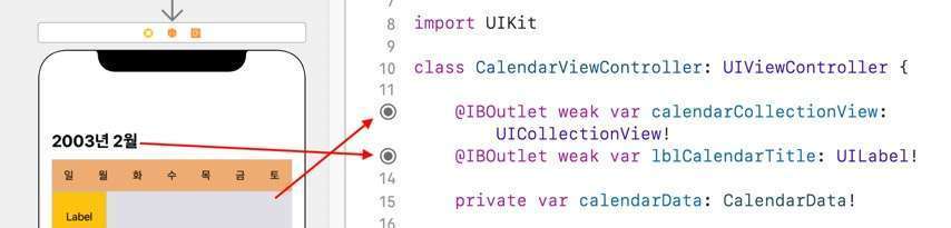 달력의 셀에 대한 커스텀 클래스가 필요합니다. 프로젝트에 다음 코드를 추가하고, @IBOutlet 연결을 수행합니다. (연결되지 않으면 프로젝트 창을 껐다 켜면 됩니다.)