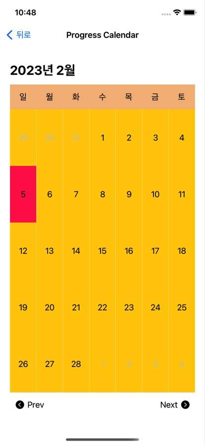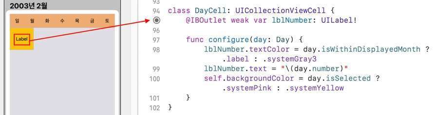 lblNumber: 숫자가 표시될 레이블configure함수는 셀의 내용을 채우는 부분으로,Day타입의 인스턴스를 받습니다.- lblNumber.textColor = …