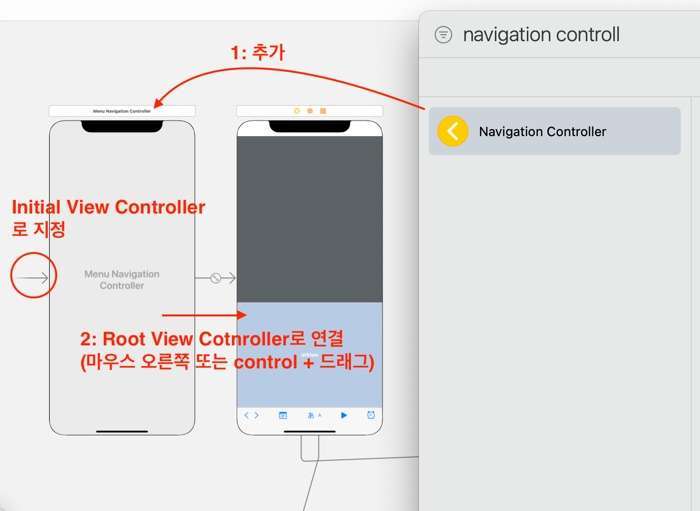 1) Navigation Controller를 추가하고, 원래 뷰 컨트롤러를 Root View Controller로 연결합니다