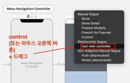 - 컨텐츠 뷰 컨트롤러 부분에서 원래 뷰 컨트롤러를 버리고 다른 뷰 컨트롤러를 표시하도록 설정