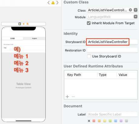 2) 사이드 메뉴가 될 뷰 컨트롤러를 생성하고, Storyboard ID를 부여합니다.