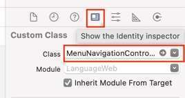 4) Navigation Controller의 커스텀 클래스로 3번 섹션에서 만든 MenuNavigationController를 추가합니다.