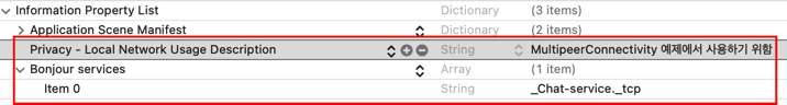 info.plist에 아래 항목들을 추가합니다. 아래 두 항목은 필수로 입력해야 멀티피어 통신이 가능합니다.