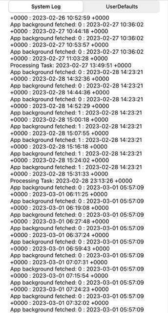 아래 스크린샷은 백그라운드 작업이 실행할 때마다 텍스트 파일에 로그를 기록하도록 한 경우에서 해당 로그의 기록입니다. (App Background는 앱 리프레시 작업, Processing Task는 프로세싱 작업)