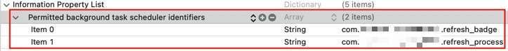 형식은 일반적으로 기존 앱 번들 식별자(App Bundle Identifier) + 백그라운드 요소 이름으로 지정합니다. 아래 스크린샷은 App Refresh Task(refresh_badge)와 Processing Task(refresh_process) 두 개를 추가했습니다.