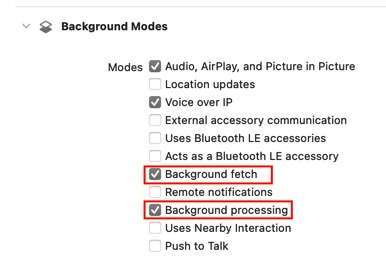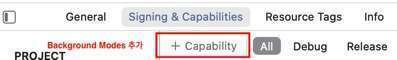 프로젝트 설정 메뉴에서 Signing and Capabilities 탭 > + Capability 로 Background Mode를 추가한 뒤