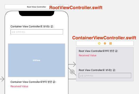 위와 같은 형태의 뷰 컨트롤러 간 데이터를 교환하고 싶다면 어떻게 해야 할까요? 예를 들어 RootVC와 ContainerVC안에는 각각 텍스트 필드와 레이블이 존재하고 서로 값을 주고받고 표시하고 싶은 경우입니다.