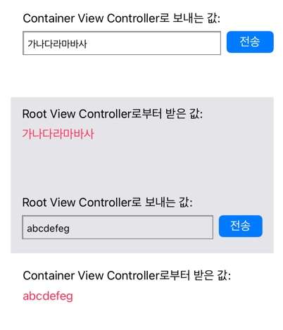 두 가지 경우가 있는데, RootVC에서 ContainerVC로 보내는 경우는 비교적 간단하고, 그 반대의 경우는 대리자 패턴(Delegate pattern)을 사용해야 합니다.
