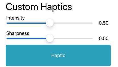 1 2 3@IBAction func btnActGenerateCustomHaptic(_ sender: UIButton) { customHaptics?.generateHaptic(intensity: slideIntensity.value, sharpness: slideSharpness.value) }