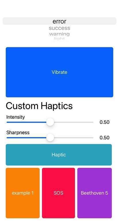 아래 메서드를 통해 다양한 수치의 햅틱을 체험해볼 수 있습니다. UI 부분에 대한 설명은 분량상 생략합니다.