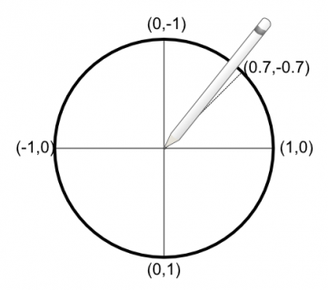 x 방향은 코사인을 사용하고 y 방향은 사인을 사용합니다. 예를 들어, 위 그림과 같이 펜을 잡고 있다면(원래 수평 방향에서 반시계 방향으로 약 45도) 단위 벡터는 (cos(45), sin(-45)) 또는 (0.7071, -0.7071)입니다.