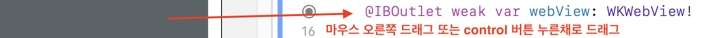 뷰 컨트롤러 소스 파일에 웹킷 뷰를 연결한 @IBOutlet 변수를 추가합니다.