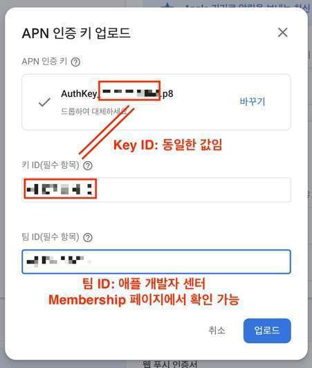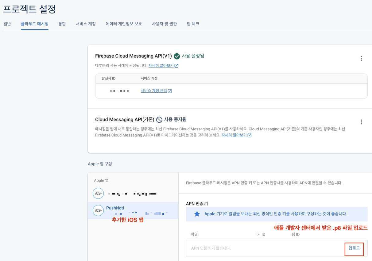 2: 프로젝트 설정 > 클라우드 메시징 탭에 APN 인증 키 추가