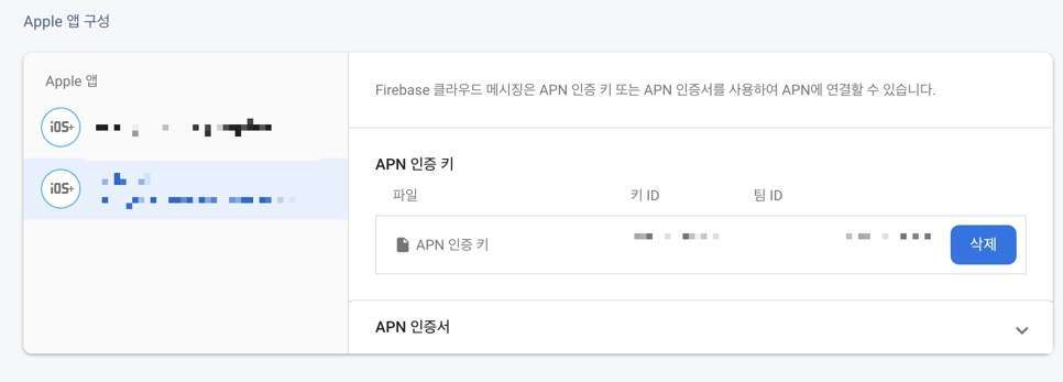 다음 프로젝트 설정(위 스크린샷의 톱니바퀴 모양 버튼)에 들어간 뒤 개발자 센터에서 발급받은 iOS 푸시 알림의 키의 .p8 파일을 업로드하고 ID 정보를 입력합니다.