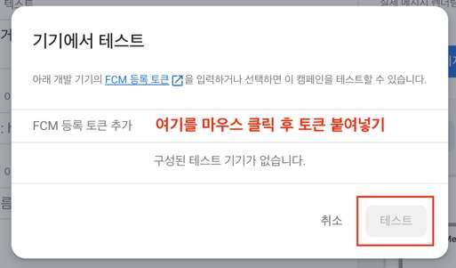위에서 복사했던 디바이스 토큰 값을 붙어넣기 한 뒤 추가합니다. 그리고 [테스트] 버튼을 클릭하면 테스트 메시지가 디바이스 토큰을 통해 내 기기로 전송됩니다.