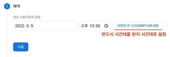 최초 설정은 ‘지금’이라고 표시되어 있어도 서버의 시간대가 다르기 때문에(미국 LA 기준) 메시지가 제 시간에 전송되지 않는 경우가 있습니다. 시간대를 반드시 대한민국 시간대로 변경 후 설정합니다.