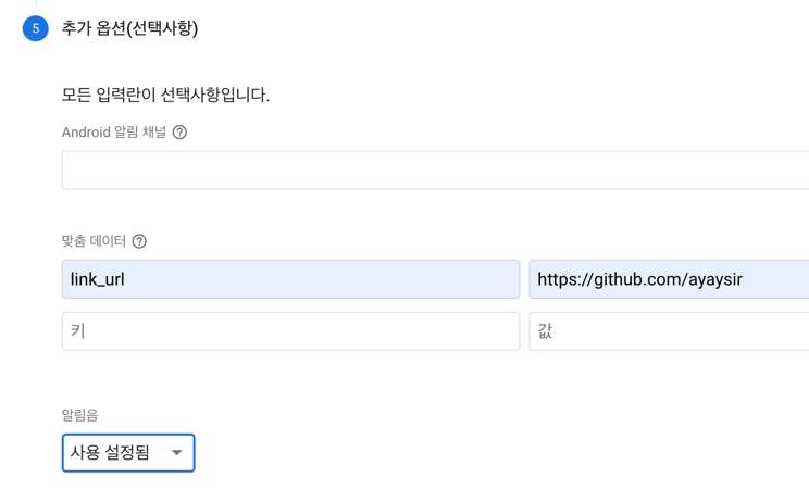 다음 5번 메뉴의 추가 옵션(선택사항) 메뉴에서 맞춤 데이터를 설정합니다. 이 부분은 위 AppDelegate.swift 코드의 link_url과 같이 userInfo에 저장되는 부분입니다.