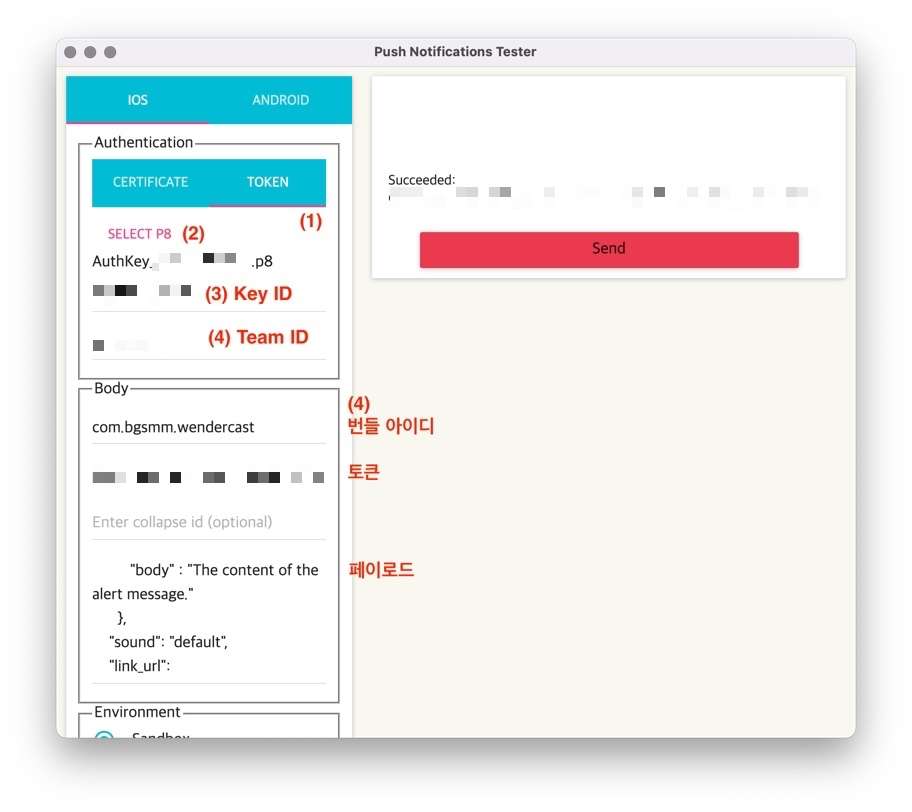 - 본문 아래에 앱의 번들 ID와 기기 토큰을 입력합니다. 요청 본문을 다음과 같이 변경합니다.