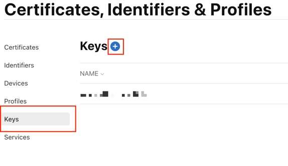 푸시 알림을 보내려면 인증 키가 필요합니다. Certificates, Identifiers & Profiles을 선택한 다음 왼쪽 창에서 Key를 찾습니다. 키 제목의 오른쪽에는 + 버튼이 있습니다. 클릭합니다.