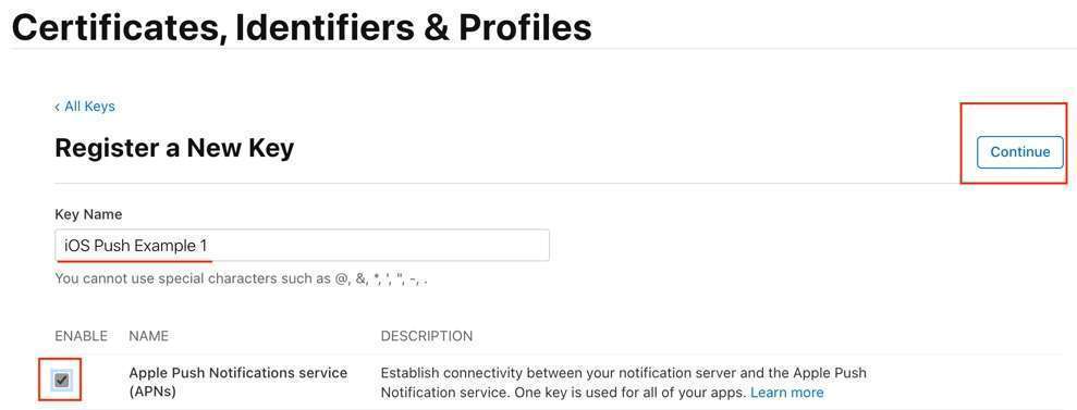 적절한 키 이름을 지정합니다. Key Service에서 Apple Push Notifications service(APNs)을 선택합니다.