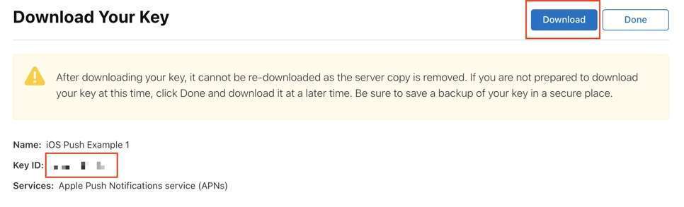 Download를 클릭합니다. 다운로드한 파일의 이름은 AuthKey_4SVKWF966R.p8의 형태와 같습니다. 이 파일을 보관하세요. 알림을 보내려면 이 파일이 필요합니다. 파일 이름의 4SVKWF966R 부분은 Key ID입니다. 이것도 필요합니다.