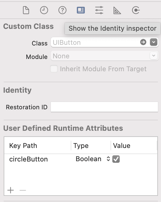또는 스토리보드에서 버튼 클릭 후 Identity Inspector의 User Defined Runtime Atrribute에서 지정합니다.