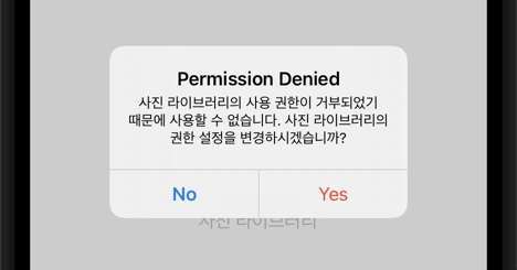 사진을 선택하고자 하는 경우 경고창이 뜨면서 권한 설정 변경을 유도합니다. Yes를 클릭하면 시스템의 설정 앱으로 이동합니다.