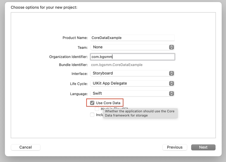 아직 프로젝트를 생성하지 않았다면 App 생성시 아래 사항만 체크하면 Core Data 프로젝트를 만들 수 있습니다.