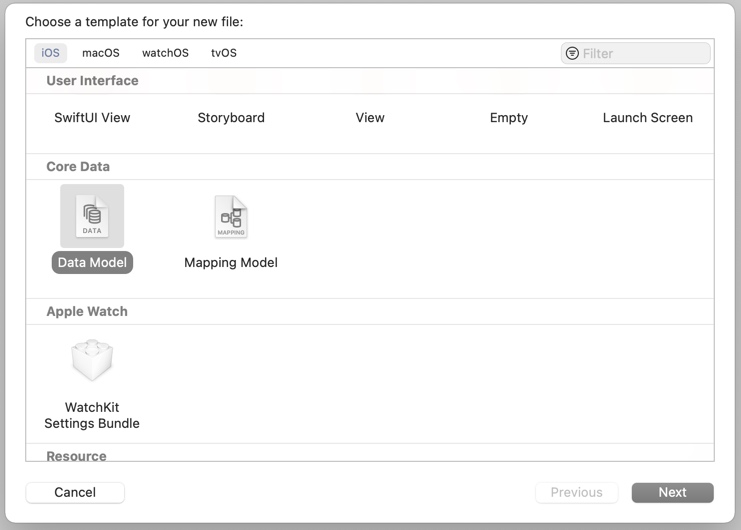 프로젝트에 새 파일을 추가 메뉴를 열고, Core Data의 Data Model을 추가합니다. 이름은 위에서 지정한 이름을 사용합니다.