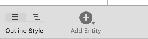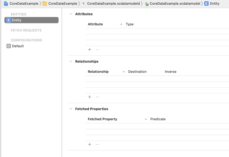 다음 CoreDataExample.xcdatamodeld 파일을 열면 에디터가 나타납니다. 하단에 있는 Add Entity 버튼을 눌러 Entity를 추가합니다. Entity는 데이터베이스의 테이블과 비슷한 개념입니다.