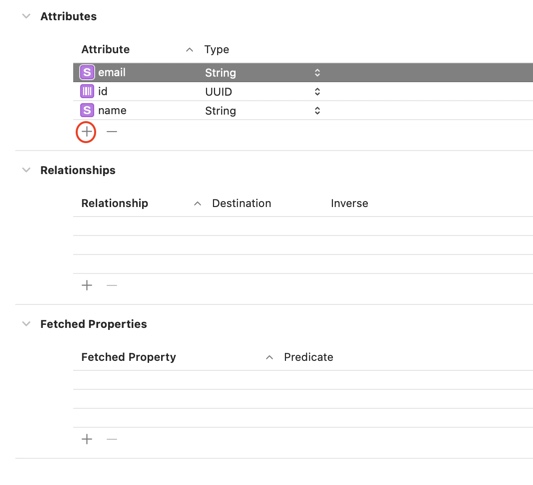 다음 Attribute를 추가합니다. Attribute는 데이터베이스의 컬럼, 필드와 비슷한 개념입니다. 이름과 메일 주소, 그리고 ID를 생성합니다. Core Data는 한 객체가 영속성(persistence)를 지니기 때문에 각 개체가 고유한 특성을 지닙니다. 따라서 원론적으로 ID를 특별히 만들 필요는 없지만, 저처럼 초보 단계에서는 ID를 만드는게 편하다고 생각했기 때문에 ID attribute를 추가하도록 하겠습니다.