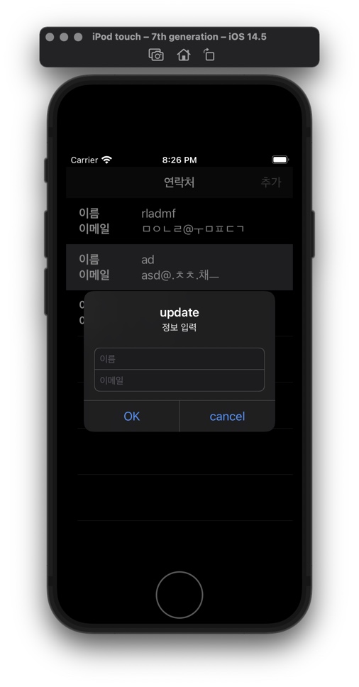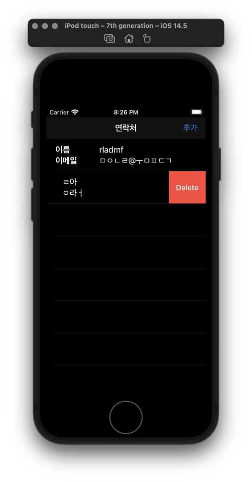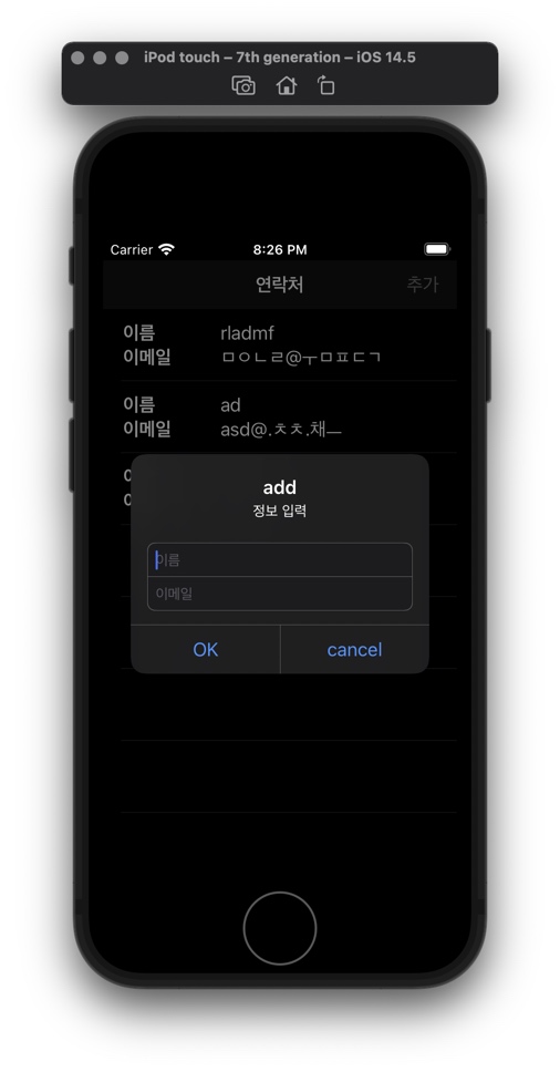 여기서는 이름과 메일 주소를 저장하고 테이블 뷰를 통해 정보들을 표시하는 앱을 만든다고 가정합니다.