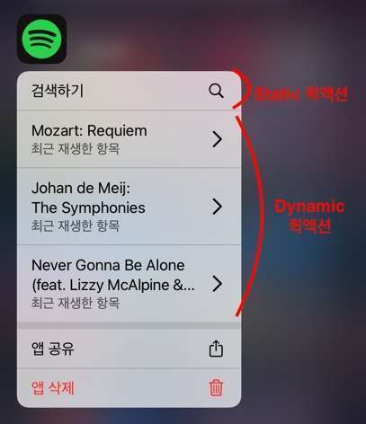 아래는 모 음악 앱의 퀵 액션 메뉴인데 첫 번째 [검색하기]는 어느 상황에서도 검색 메뉴로 이동하므로 Static 퀵 액션이며, 그 아래 3개 메뉴는 최근 감상한 음악에 따라 키워드에 따라 이름과 이동 페이지가 달라지므로 Dynamic 퀵 액션입니다.
