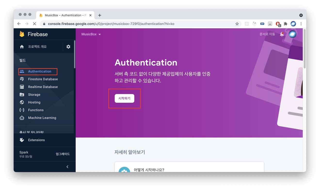 1. 파이어베이스 콘솔에서 프로젝트를 생성한 후, 빌드 > Authentification 메뉴를 클릭합니다.