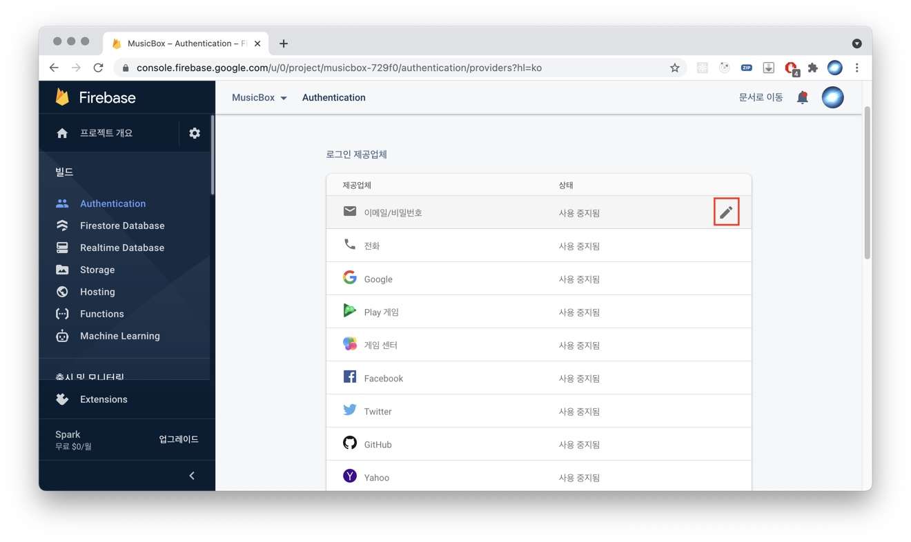 3. 그러면 아래와 같이 로그인 제공업체라는 페이지가 뜨게 되는데 여기서 이메일/비밀번호 옆의 연필 모양의 버튼을 클릭합니다.