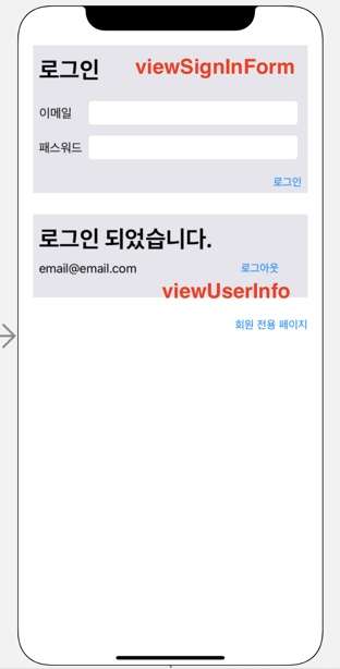 아래 뷰 컨트롤러에서 회색 배경의 두 하위 UIView가 있습니다. 로그인이 되지 않은 상태라면 위의 로그인 폼(viewSignInForm)만 보여주고, 로그인이 되었다면 아래 사용자 정보 뷰(viewUserInfo)만 보여줍니다.