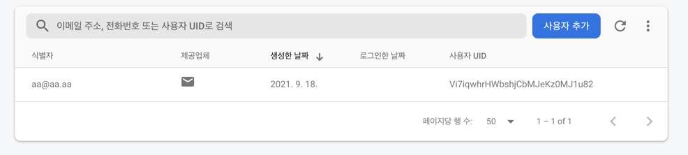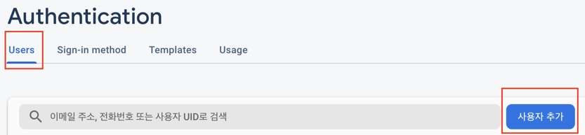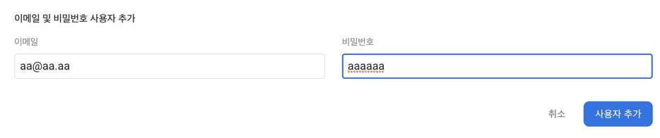 6. 임의의 이메일 주소, 비밀번호를 입력한 후 사용자 추가 버튼을 클릭합니다.