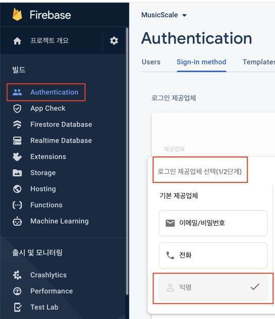 파이어베이스 콘솔에서 익명 인증 절차를 추가합니다.