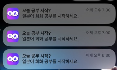 - 월요일 ~ 금요일에 오전 9:30분부터 오후 9:30분까지 30분 간격으로 앱을 열어 공부하라는 로컬 알림(Local Notification)을 보냅니다.
