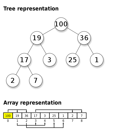 힙은 최댓값 및 최솟값을 찾아내는 연산을 빠르게 하기 위해 고안된 완전이진트리(complete binary tree)를 기본으로 한 자료구조(tree-based structure)입니다. 힙의 속성으로는 A가 B의 부모노드(parent node) 이면, A의 키(key)값과 B의 키값 사이에는 대소(크거나 작은)관계가 성립합니다.