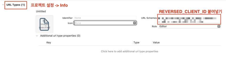 프로젝트 설정에서 Info 탭으로 들어가면 맨 아래 URL Types 란이 있습니다. + 버튼을 눌러 새로운 URL Type을 추가하고 URL Schemes 란에 REVERSED_CLIENT_ID 값을 붙여넣기합니다.