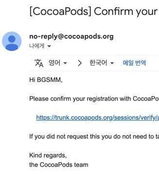 다음 CocoaPods에 이메일을 인증하고 사용자 등록을 할 차례입니다. 터미널에 아래 명령어를 입력합니다.